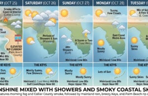 Friday brings morning fog and Collier County smoke, followed by mainland rain, breezy Keys, and Palm Beach rip currents.