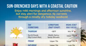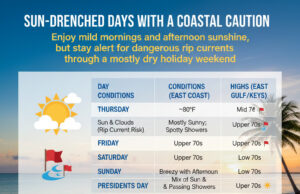 Enjoy mild mornings and afternoon sunshine, but stay alert for dangerous rip currents through a mostly dry holiday weekend.
