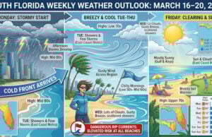 Monday storms transition to a breezy, cooler week featuring elevated rip current risks and highs in the mid seventies.