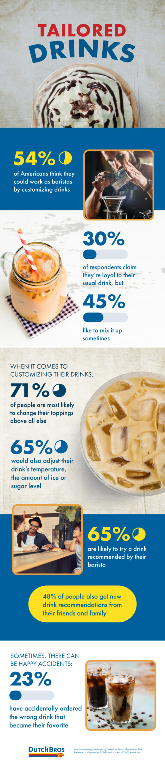 Conducted by OnePoll on behalf of Dutch Bros, the research also found people will select random drinks to try when they’re craving something different from their usual orders or try to create something based on their preferences (50%, each).