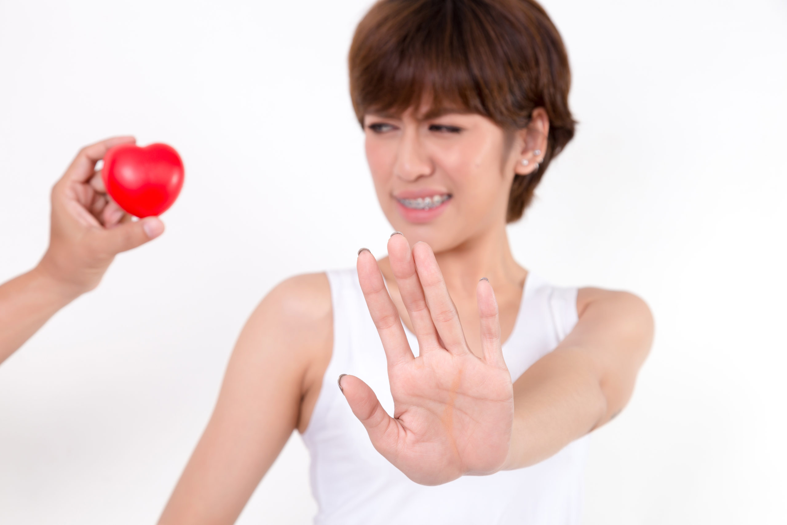 freepik/Disappointed woman rejecting the red heart of her boyfriend. Iso