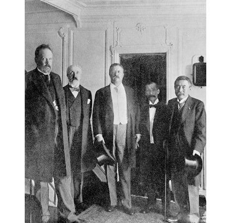 Title: Roosevelt Treaty of Portsmouth 1905 Image ID: 460504098 Article: President Theodore Roosevelt, center, is shown aboard the presidential yacht Mayflower with, left to right: Russian chairman of the Committee of Ministers, Count Sergei Witte; Russian Ambassador to the U.S., Baron Roman Romanovich Rosen; Baron Komura Jutaro, Foreign Minister of Japan, and Japanese Ambassador Kogoru Takahira, at the signing of the Portsmouth Treaty, in Portsmouth, N.H., August 23, 1905. (AP Photo)