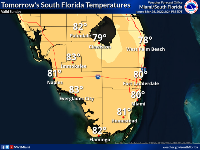 Sunday will feature a mix of sun and clouds with breezy conditions in the east coast metro area, while the Gulf coast will see lots of sun and a gusty breeze. Sunday’s highs will be in the low 80s in the east coast metro area and the mid-80s along the Gulf coast.
