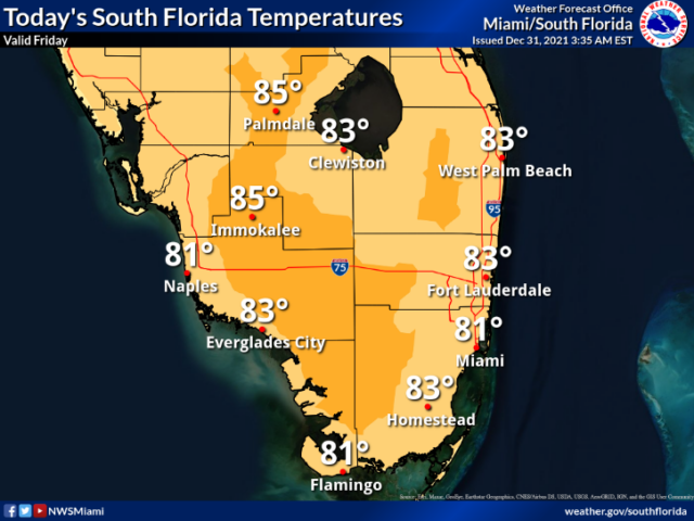Friday starts with early fog around South Florida, with a Dense Fog Advisory for western portions of our area until 10 am.  When the fog is gone, we’ll see plenty of warm sun and a few clouds as we count down to the end of 2021.  A moderate risk of dangerous rip currents remains along the Palm Beach County coast.  New Year’s Eve will be warm and dry.  Friday’s highs will be mostly in the mid-80s.