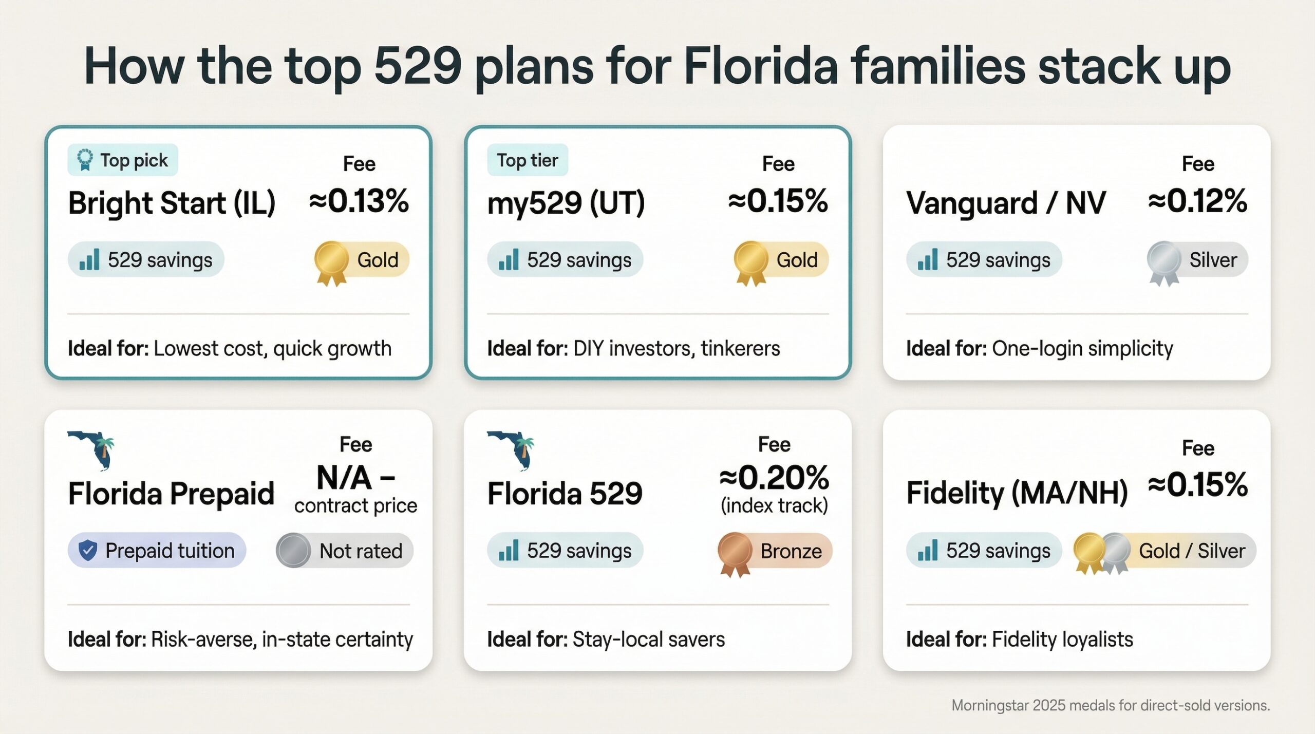 | Florida 529 | 529 savings | ≈ 0.20% (index track) | 20 enrollment-year options | Bronze | Stay-local savers |