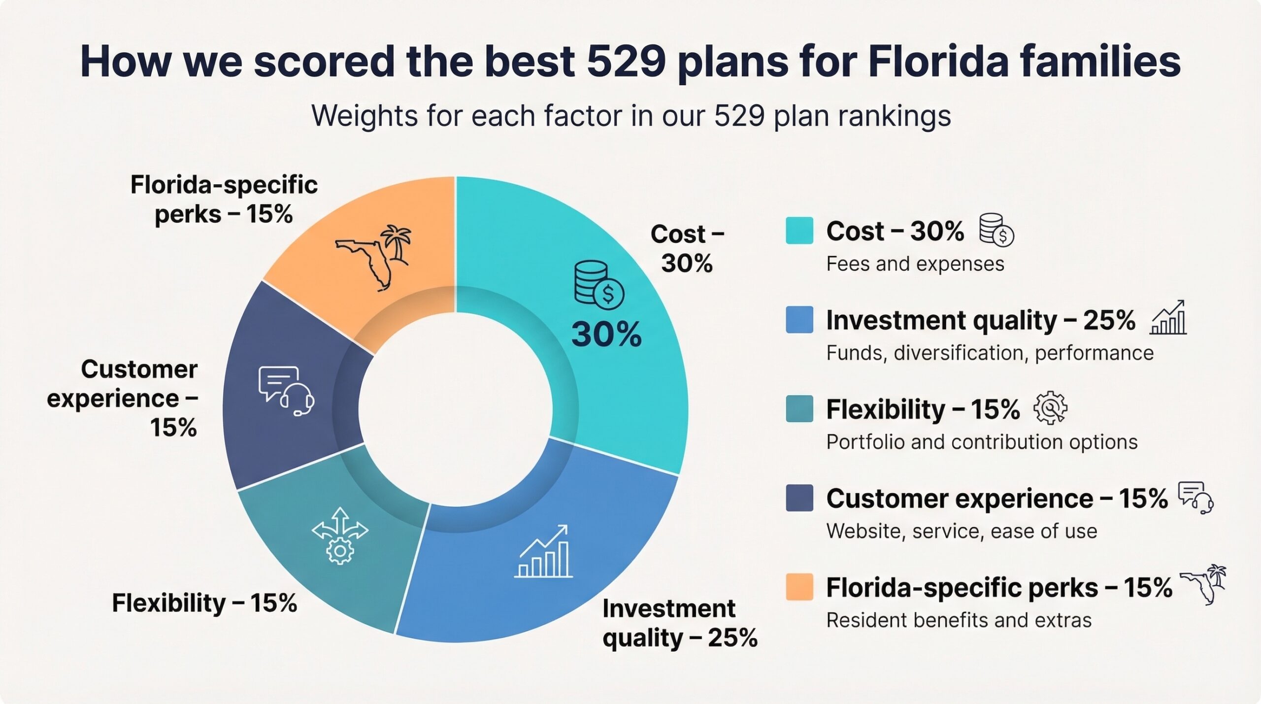 Flexibility, customer experience, and Florida-specific perks make up fifteen percent each. Can grandparents gift easily? Does the website invest contributions the same day? Will the plan still look good if you move to Atlanta next year? Practical touches like these separate a good plan from a great one.