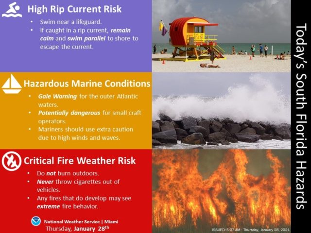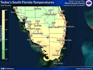 Thursday starts with patchy to dense fog around most of South Florida. Then the day features breezy conditions and early clouds giving way to good sun as a front moves in. The Gulf Coast and inland regions will be under a red flag warning for potential brush fires. A high risk of dangerous rip currents is in place along the Palm Beach County coast, and there’s a moderate rip current risk at the beaches of Broward and Miami-Dade. Highs on Thursday will be in the mid-70s in the east coast metro area and the low 70s along the Gulf coast.