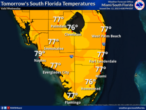 Wednesday features breezy conditions, plenty of clouds, and periods of showers throughout the day. Evening showers are also likely in the East Coast metro area and much of the Keys. A high risk of dangerous rip currents remains at the Atlantic beaches through at least Thursday evening. Highs on Wednesday will be in the upper 70s.