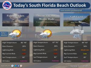 South Florida will see some breezy showers on Tuesday as the tropics get busy early. Tuesday features a mix of sun and clouds with showers passing through on the strong ocean breeze. A high risk of dangerous rip currents remains in place at the Atlantic beaches at least through Tuesday. Tuesday’s highs will be near 90 degrees.
