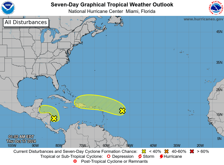 In the tropics, we’re still keeping an eye on the wave in the central Atlantic. The National Hurricane Center gives it a medium chance of becoming a depression when it reaches the Lesser Antilles this weekend. But the possibility of development may be diminishing as the wave continues to battle dry air and will run into strong wind shear. Elsewhere, the area of low pressure in the southwestern Caribbean has a low chance of developing before it reaches the Central American coast, but it will bring very heavy rain and possible flooding to the region.