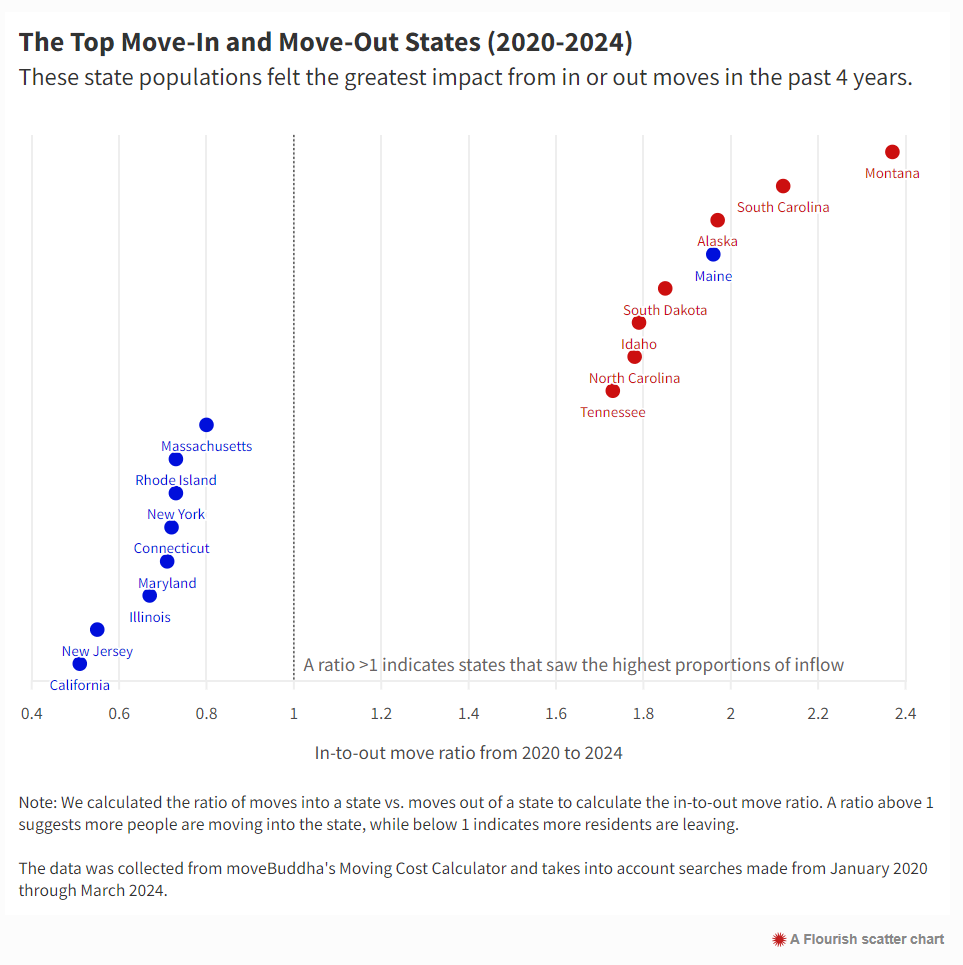 For moves spanning 2020 to 2024, just 1 blue state appears in the top eight for most in-moves versus out-moves: Maine (20 electoral votes, split).