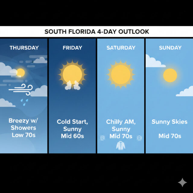 Monday’s forecast calls for chilly morning lows in the low to mid-50s on the mainland, followed by sunny skies across South Florida. Highs on Monday will be in the mid 70s on the mainland and near 70 degrees in the Keys.