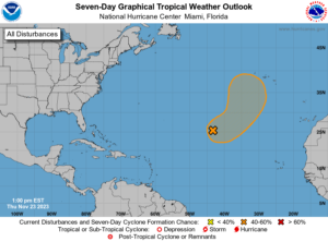 In the tropical Atlantic, the only thing we’re watching is the area of low pressure in the middle of the ocean. This feature has a medium chance of becoming a depression, but its window of opportunity to do that will end early next week as it moves northeastward into colder waters.