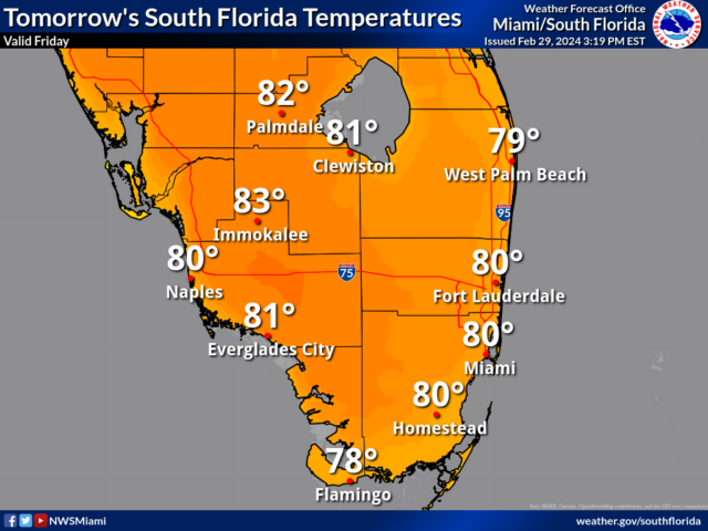 Saturday will bring lots of clouds and a bit of sun at times.  The gusty breeze continues in the East Coast metro area.  A storm is possible in spots late at night.  Saturday’s highs will be mostly in the low 80s on the mainland and near 80 degrees in the Keys.