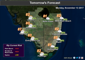 Breezy ShowersIt’s all about breezy showers in South Florida on Sunday. After a few early showers in spots, Sunday will bring rounds of showers on the breeze along with plenty of clouds. A high risk of rip currents remains in place at the Atlantic beaches on Sunday and will last through Monday. Sunday’s highs will be in the mid 80s.