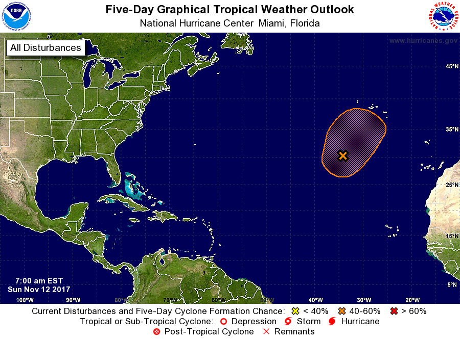 In the tropics, we’re watching an area of showers in the eastern Atlantic that has a low chance of developing into a subtropical depression during the next 5 days.