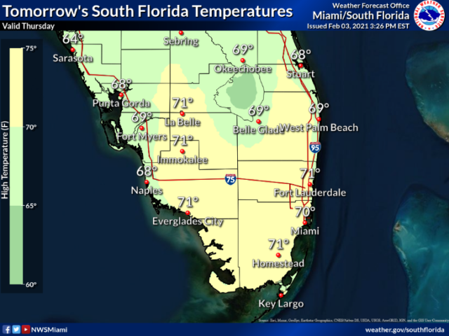 Thursday is off to a cold start, with a frost advisory until 8 am for inland Palm Beach County and most of Collier County (except the immediate Gulf coast). We’ll see lots of sun during the day and a bit of an ocean breeze in the afternoon. Highs on Thursday will be around the 70-degree mark.