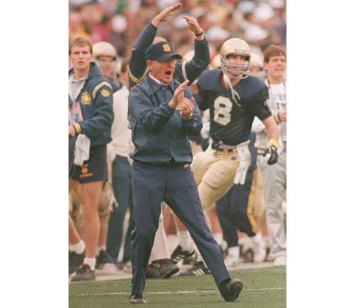 Title: Notre Dame Holtz Statue Football Image ID: 8901020365 Article: **FILE** In this Jan. 2, 1989 file photo, Notre Dame head coach Lou Holtz cheers on his team against West Virginia in the Fiesta Bowl in Tempe, Ariz. Holtz will be honored with the dedication of a statue at a reunion with about 70 members from that national championship team, Saturday, Sept. 13, 2008. The statue depicts him calling a play on the sidelines with two players beside him. (AP Photo/Jeff Robbins, File)