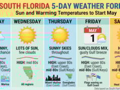 2017 will come to a cool end in South Florida on Sunday as we start to feel some of the effects of the chill that’s affecting much of the country. But at least we’ll be snow-free, unlike central Florida (including the Tampa area), that could see some flakes as a strong front moves in. Here at home, our rather chilly and foggy start on Sunday will give way to a mix of good sun and clouds on the breeze. A moderate risk of dangerous rip currents continues at the Atlantic beaches. Highs on Sunday will be in the low to mid 70s. New Year’s Eve will be dry but cool by midnight.