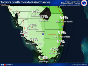 Monday morning starts with fog around much of South Florida, with a dense fog advisory until 8 am. Then the day features a mix of sun, clouds, and periods of showers in the east coast metro area as a front moves in. A high risk of dangerous rip currents is in place along the Palm Beach County coast, and there’s a moderate rip current risk at the beaches of Broward and Miami-Dade as well as along the Gulf coast. Highs on Monday will be mostly in the mid-80s in the east coast metro area and near 80 degrees along the Gulf coast.