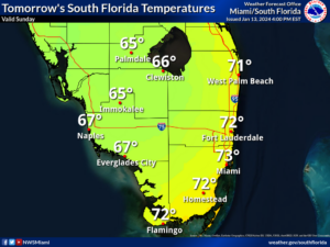Wednesday morning lows will range from the mid-50s to the mid-60s. The day will see a mix of sun and clouds with a brisk breeze along the Gulf Coast and in much of the Keys. Wednesday’s highs will top out the upper 60s in the East Coast metro area and the Keys, while the Gulf Coast will only reach the mid-60s.