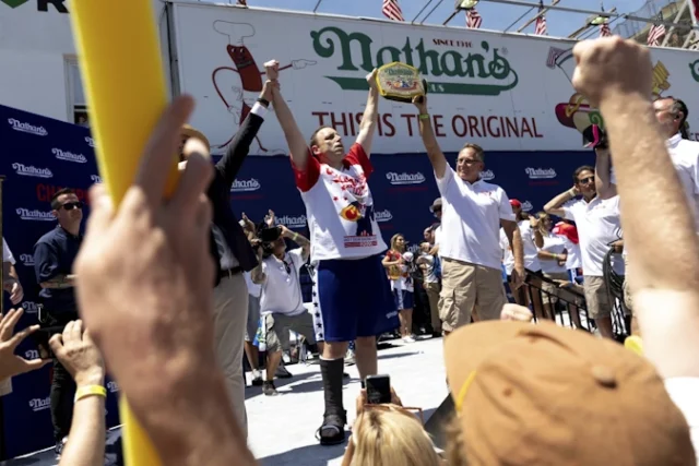 Last year’s 2nd place winner was Geoffrey Esper from Oxford, Massachusetts, who downed 49 dogs. Third place went to Australia’s James Webb with 47. That was far from Chestnut’s best effort: his record was 76 Nathan’s Famous hot dogs and buns in 10 minutes in 2021.