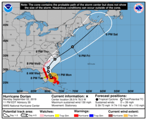 Hurricane Dorian was expected to make its closest approach to South Florida on Tuesday morning.  We can expect this dangerous hurricane to accelerate, and we’re watching closely for impacts along the central and northern Atlantic coast of our state.