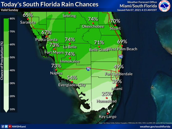 Sunday features patchy fog to start, followed by showers and a few storms on a gusty breeze.  Look for a mix of sun and clouds in the east coast metro area and mostly cloudy skies along the Gulf coast.  Highs on Sunday will be in the mid-80s in the east coast metro area and the upper 70s along the Gulf coast.