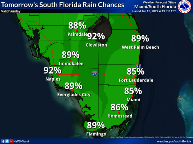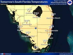 Sunday features windy conditions with clouds, showers, and storms moving from west to east as a front sweeps across South Florida during the morning and early afternoon. A few strong storms are possible. Then temperatures will drop as cooler air filters in. Look for an increasing risk of dangerous rip currents at the beaches of both coasts on Sunday and Monday. Highs on Sunday will be in the upper 70s in the east coast metro area and the mid-70s along the Gulf coast.