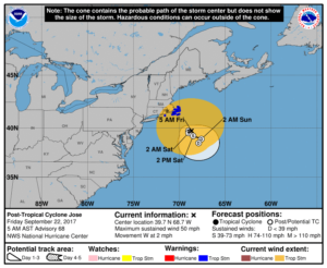 Elsewhere, Jose is now a post-tropical cyclone but continues to bring tropical storm force winds, heavy rain, and rough surf to Cape Cod, Martha’s Vineyard, and Nantucket. At 5 am Friday, Jose was located near 39.7 North, 68.7 West, and was inching west at 2 miles per hour. Maximum sustained winds were 50 miles per hour.