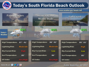 South Florida will see showers and storms as fall begins on Friday afternoon. After a few early showers, Friday features some sun, a moderate risk of dangerous rip currents at Broward and Miami-Dade beaches (a high risk off Palm Beach County) and periods of passing showers and storms. Highs on Friday will be in the low 90s.