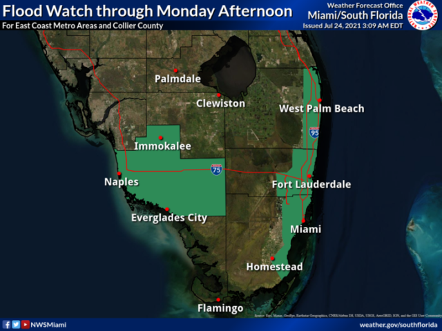 Monday features some sun but periods of showers and storms once again. Heavy rain is possible, so the flood watch continues for both the east coast metro area and the Gulf coast. A moderate risk of dangerous rip currents is in place at the Atlantic beaches. Highs on Monday will be in the low 90s.