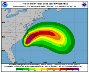 Tropical Storm Arthur is bringing heavy rain to eastern North Carolina. At 5 am Monday, Arthur was located near 33.5 North, 76.6 West, about 85 south of Morehead City. Arthur was moving north-northeast at 14 mph and had maximum sustained winds of 45 mph. Arthur could strengthen slightly before moving out to sea and dissipating by late in the week.