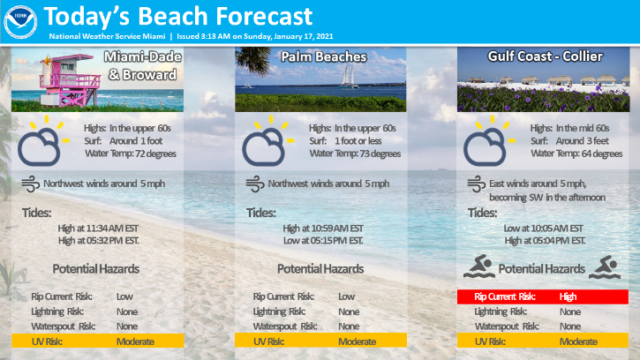 Sunday features lots of clouds along the Gulf coast, while the east coast metro area will see some sun but more clouds.  A high risk of dangerous rip currents remains along the Gulf coast.  Highs on Sunday will be in the upper 60s in the east coast metro area and the mid-60s along the Gulf coast.