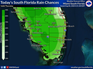 Friday will bring a mix of sun and clouds in the morning, with showers and a few storms developing during the afternoon. Friday’s highs will be near 90 degrees in the east coast metro area and the low 90s along the Gulf coast.