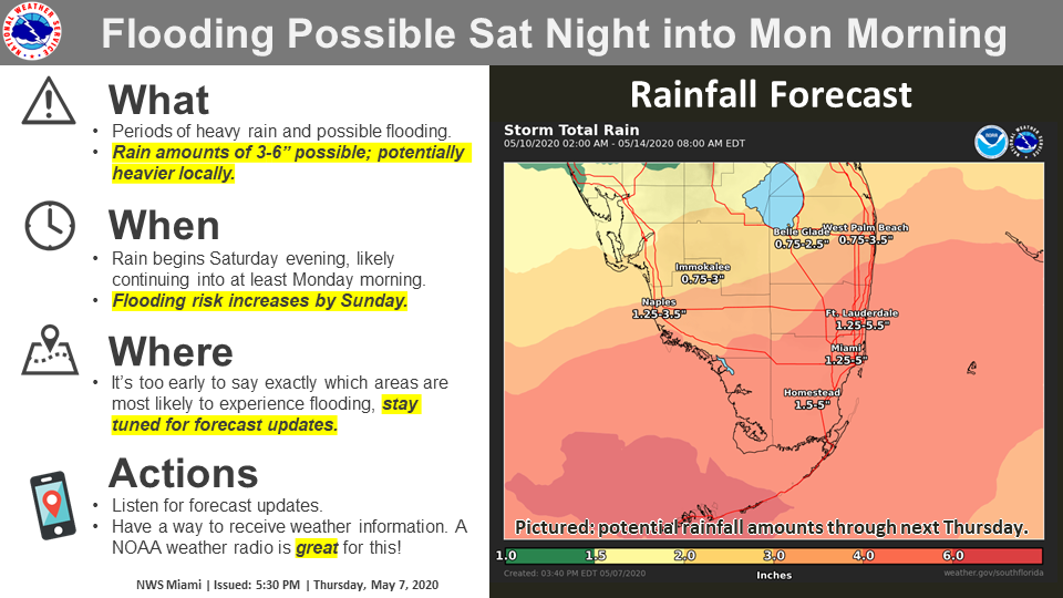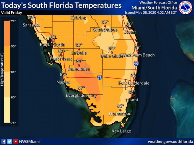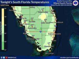 Mothers Day will be cloudy, breezy, and stormy. Expect periods of heavy rain throughout the day and into the night. We could see a few strong storms, with dangerous lightning and damaging winds, especially in northern Broward. Sunday’s highs will be in the upper 70s.