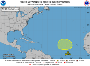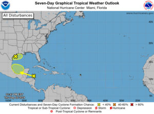 Elsewhere, the wave in the western Caribbean is not expected to develop until it crosses the Yucatan and enters the Bay of Campeche this weekend — but the chances of development are still low.  An area of disturbed weather off the Texas coast is not expected to become a depression but will bring heavy rainfall to the northern U.S. Gulf coast this weekend.