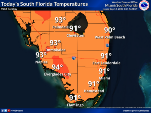 Tuesday features mostly sunny skies and some mid to late afternoon showers and storms in the East Coast metro area. The Gulf Coast will be sunny in the morning, with some clouds, showers, and storms developing in the afternoon. A moderate risk of dangerous rip currents is in place along the Palm Beach County coast, and the rip current risk will increase at all the Atlantic beaches by midweek. Highs on Tuesday will be mostly in the low 90s — but it will feel about 10 degrees hotter, so stay hydrated and out of the sun.
