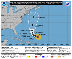 In the tropics, Hurricane Lee remains a powerful major hurricane and will not significantly weaken until after turning more to the north in a day or so. Swells from Lee are already creating hazardous surf conditions and dangerous rip currents along the U.S. East Coast, the Bahamas, and Bermuda and will continue all week.