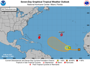 Elsewhere, Margot was on the verge of hurricane strength at midday on Monday, and it’s likely to remain a hurricane for a couple of days as it moves northward in the middle of the Atlantic. The wave in the eastern Atlantic is likely to become a depression by the weekend as it moves westward or west-northwestward into the central Atlantic. In the meantime, this wave is forecast to absorb a much weaker wave several hundred miles to its northwest, probably by the middle of the week.