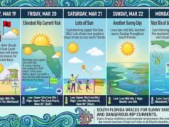 Sunday features hot sun and a few morning storms in the east coast metro area, but look for lots more storms in the afternoon and evening. The Gulf Coast will see a mix of sun, clouds, and showers in the morning, with storms taking over in the afternoon and lasting into the evening. A moderate risk of dangerous rip currents remains along the Palm Beach County coast. Highs on Sunday will be in the low 90s right at the Atlantic coast and in the mid-90s elsewhere — but it will feel much hotter (especially in the Keys), so stay hydrated and out of the sun.