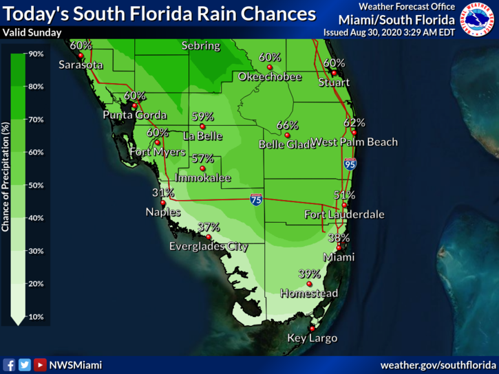 Sunday features plenty of hot sun with periods of showers and storms from late morning through the afternoon. Much of the activity will be in the east coast metro area. Highs on Sunday will be in the low 90s at the coasts and the mid-90s elsewhere. But it will feel even hotter, so stay hydrated and out of the midday sun.