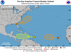In the tropics, the wave in the central Atlantic will bring gusty winds and heavy rain to portions of the Lesser Antilles on Sunday. Some potential for development is possible when this feature reaches the central and western Caribbean in a few days. Another wave in the eastern Atlantic has a medium chance of becoming a depression during the next 5 days. And finally, a low is expected for form off the southeast U.S. coast in a day or so and could become a depression during the next 5 days. But this feature is expected to move generally northeastward, away from land.