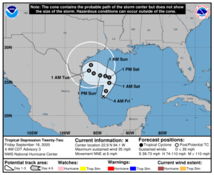 Tropical Depression # 22 has formed from the low in the southwestern Gulf of Mexico, and it is likely to be a tropical storm by late Friday (and exhaust the 2020 list of Atlantic hurricane names). At 5 am, TD # 22 was located near 22.9 North, 94.1 West. and was moving north-northeast at 6 miles per hour. Maximum sustained winds were 35 miles per hour. This system will move slowly and linger near the Texas coast this weekend into early next week.
