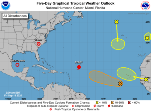 Elsewhere, the remnants of Sally are dropping heavy rain in the Carolinas. The non-tropical low in the northeastern Atlantic has a low chance of becoming a subtropical depression before reaching Portugal. The wave southwest of the Cape Verde Islands has a medium chance of developing into a depression in the next few days. Yet another disturbance over Africa is forecast to reach the eastern Atlantic in a few days and have a low chance of development. And finally, Post-Tropical Cyclone Paulette is forecast to move southward and stall out over warmer waters — and have a low chance of redeveloping tropical characteristics.
