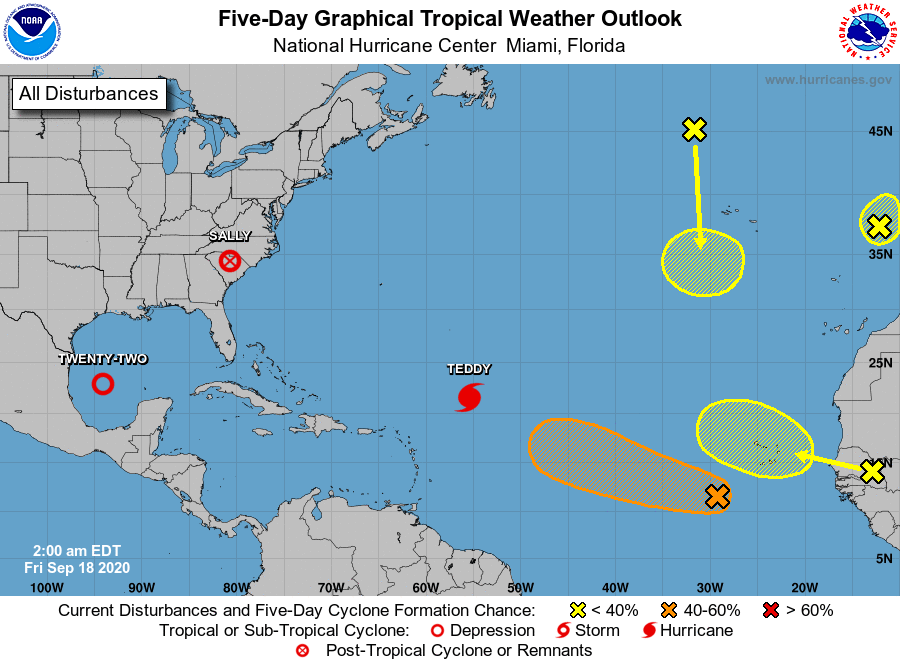 In the tropics, Teddy has become a major hurricane. At 5 am, Teddy was located 21.6 North, 55.4 West, about 935 miles southeast of Bermuda. Maximum sustained winds were 130 miles per hour. Teddy was moving northwest at 12 miles per hour. Impacts of Teddy are forecast to be felt on Bermuda on Sunday.