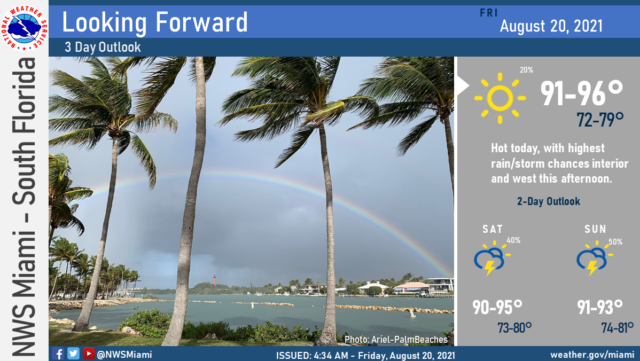 Friday features lots of hot sun and a few afternoon showers and storms, especially near the Gulf coast.  A moderate risk of dangerous rip currents remains along the Palm Beach County coast.  Highs on Friday will be in the low 90s.