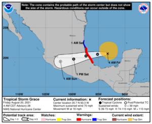 Tropical Storm Grace crossed the Yucatan on Thursday and is now strengthening in the Bay of Campeche.  At 5 am Friday, Grace was located near 20.7 North, 93.3 West, about 265 miles east of Tuxpan, Mexico.  Maximum sustained winds were 70 miles per hour, and Grace was moving west at 16 miles per hour.  A hurricane warning is in effect from Puerto Veracruz to Cabo Rojo.  Grace is expected to be a hurricane at landfall Friday night.