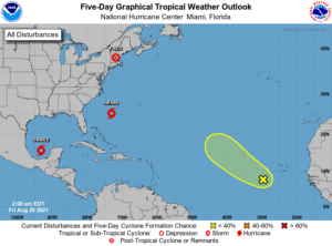 Tropical Storm Henri is threatening portions of the Northeast on Sunday.  At 5 am Friday, Henri was located near 30.2 North, 73.1 West, about 780 miles south-southwest of Nantucket, Massachusetts.  Maximum sustained winds were 65 miles per hour, and Henri was moving west-northwest at 9 miles per hour.  Henri is expected to be a category 1 hurricane by Saturday, and there is a hurricane watch for much of Long Island eastward to Cape Cod and including Nantucket, Martha’s Vineyard, and Block Island.  The region can expect hurricane force winds, heavy rain, and dangerous storm surge.
