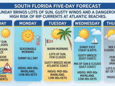 Monday will see hot sun, some clouds, and afternoon showers and storms on the mainland, while the Keys will be cloudy with periods of showers. Monday’s highs will be near 90 degrees on the mainland and in the upper 80s in the Keys.